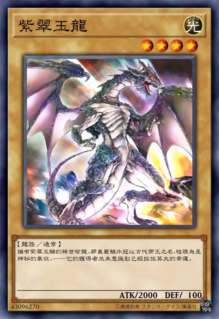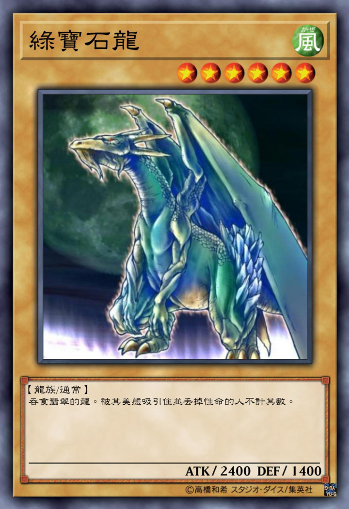 其设定是团结翡翠的巨龙,被其好意思姿眩惑而丢掉生命的东说念主不计其数。其瑕疵力也有2400点的数值,放在早期是一只不弱的白板怪兽了。